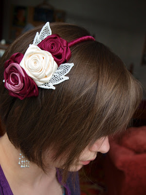 I pinned the 3 roses I chose together until I was happy with the arrangement, and then stitched them together. I then did the same with some lace leaves, and put some tiny pink pearls in as filler to hide the stitching between the leaves and the flowers, although you can't see them here. the headband was a cheap one from new look (£2) that I thought was the right colour, but turned out to be too bright, so I bought a thinner version of the same colour ribbon as the flower, and wrapped the headband with that ( I bought 2m, but probably used less than 1.5m). Then I worked out where I wanted the roses to sit on the headband, and used a curved needle filched from ma-in-law to sew through and around the headband to secure it.